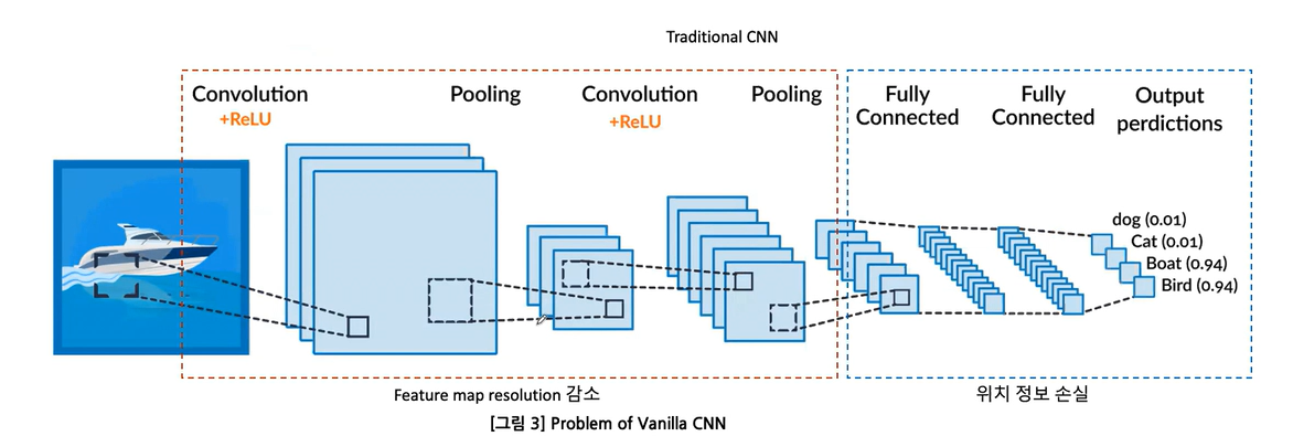 - 기존 CNN의 문제점 : 입력이미지의 정보를 잃는 문제가 발생.(Fully connected에서 피쳐 맵들을 납작하게 만든 후 output으로 출력 ->이때 위치 정보가 손실됨. )